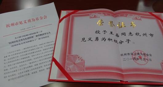 7月8日上午,杭州市见义勇为基金会在上城区政府会议室召开杭州公交车放火事件见义勇为先进群体和个人表彰会,授予集团公司投资开发部王磊同志“杭州市见义勇为积极分子”荣誉称号。
