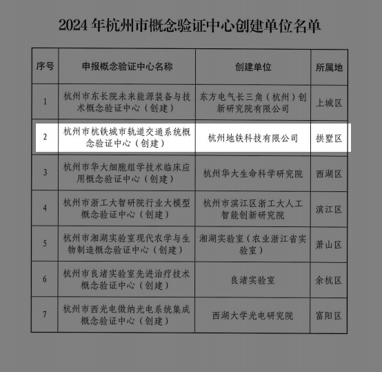 为畅通科技成果转移转化“最初一公里”,扎实推进科技成果转移转化首选地建设,根据杭州市科学技术局《杭州市概念验证中心建设工作指引(试行)》,经自主申报、区县推荐、专家评审、行政决策等程序,杭州市杭铁城市轨道交通系统概念验证中心(创建)成功入围2024年杭州市概念验证中心创建单位名单。该验证中心是轨道交通行业首家概念验证中心(创建),也是杭州市国有企业涉足概念验证领域的一次重大尝试。