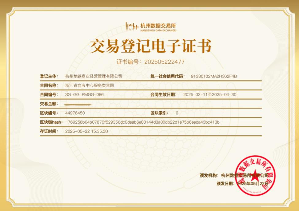 在数据要素市场化的浪潮中,作为地铁数据资产商业化的经营主体,商管公司积极落实杭州地铁集团公司数据资产战略部署,加快数据资产商业化建设,以创新驱动突破数据应用瓶颈。近日,商管公司迎来重要里程碑——成功完成首笔数据交易,并获杭州数据交易所颁发交易登记电子证书(证书编号:202505222477),标志着我们正式迈入数据价值挖掘与流通赛道,为数字化转型写下浓墨重彩的一笔!