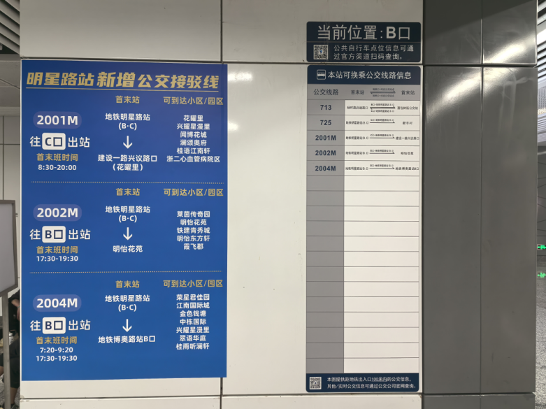 自今年1月起,运营公司联合集团公司运营管理部,深入踏勘明星路站附近小区、企业,摸排公交线路覆盖情况和居民的出行习惯,在与属地政府、交通局及交警部门等多方协作下,合理设置公交接驳点、优化出入口非机动车停车区域,确保市民能够以最短的距离、最快的速度到达地铁站。最终共设置3条地铁公交接驳线路,分别为串联兴耀星漫里、招商闻博花城等小区的2001M路,串联莱茵传奇园、霞飞郡等小区的2002M路,串联荣星君佳园、金色钱塘等小区的2004M路。