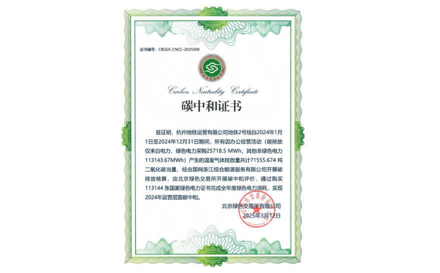 3月12日,杭州地铁2号线获得由北京绿色交易所出具的碳中和证书。